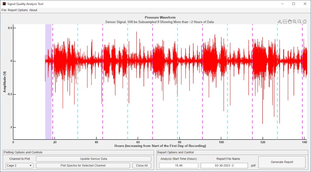 The Signal Quality Analysis Tool is a companion software that creates a visualization of sensor data to check for signal quality and noise interference in files from PiezoSleep recordings. This program creates summary reports useful for assessing the impact of the noise and identifying problems related to cage placements and other interfering activities in the environment. These reports are saved as PDF files, which can be archived and compared to run tests periodically.