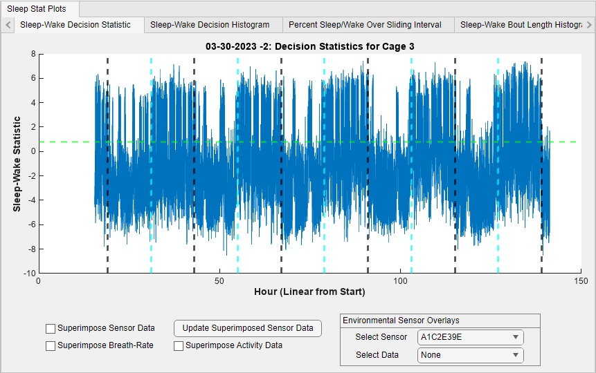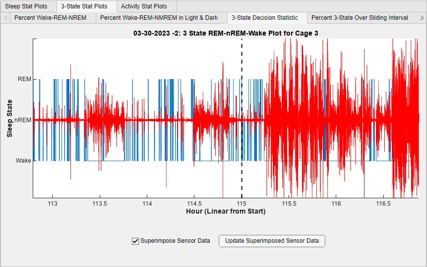 SleepStats 4 Pro includes options to characterize 3-state vigilance behaviors (Wake, NREM, REM), activity levels, and an expanded set of CSV export functions. In addition to viewing and exporting data from our environmental sensor, there are options to use the light levels to automatically segment out light and dark cycles when computing phase-based statistics. This is useful when applying non-periodic light-dark cycles.