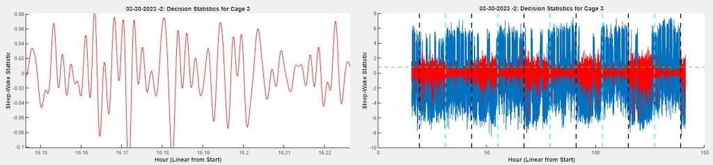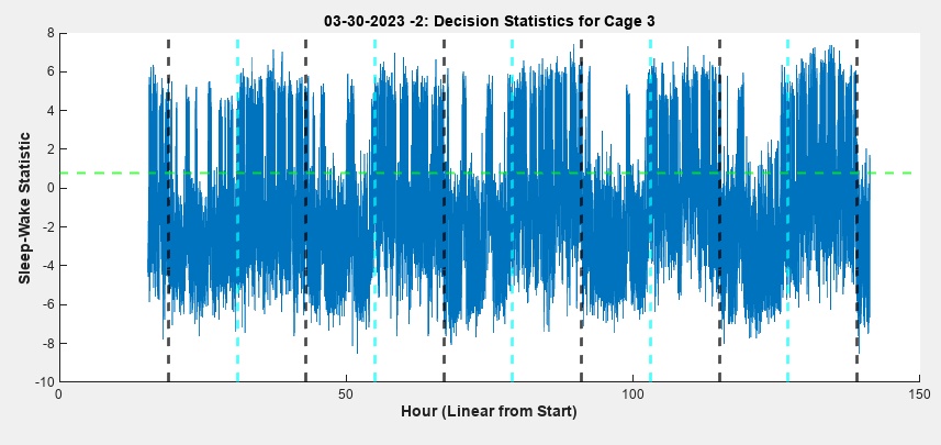 The Sleep Wake Decision Statistic is a graphical representation of the sleep and wake scores over the full recording. The horizontal green line represents the threshold between scored sleep and wake (sleep above and wake below the line). Blue and Black dashed lines represent the onset of the light period (blue) or the dark period (black).