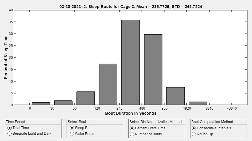 Graphical display of percent sleep (or wake) time spent in bouts of defined duration. Choose Sleep or Wake, time separated by light and dark periods, or as tonal time.