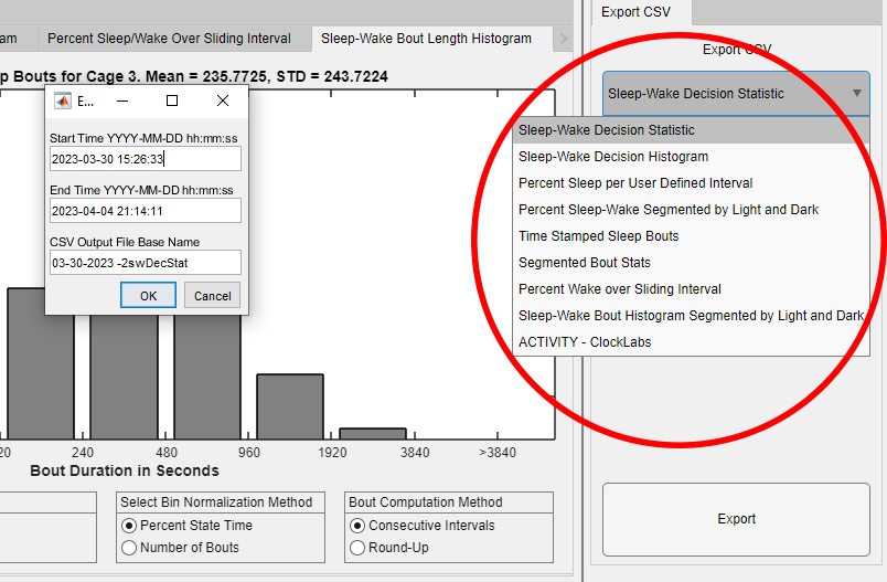 Export CSV files of sleep statistics for further analysis, including percent sleep or wake bouts and bout lengths. Customize data with user-defined intervals and select start and end times.