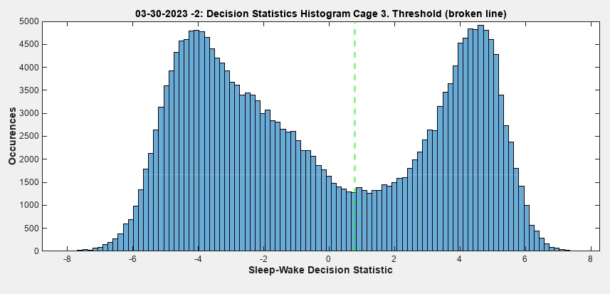 A histogram of the total sum of the Sleep Decision Statistics is presented over the recording for an individual channel. The green vertical line represents the threshold between sleep and wake values. For a mouse with normal sleep and wake patterns, decision statistics over the course of 24 hours should accumulate around low values for wake and high values for sleep. The result is a bimodal histogram of the decision statistics.Â