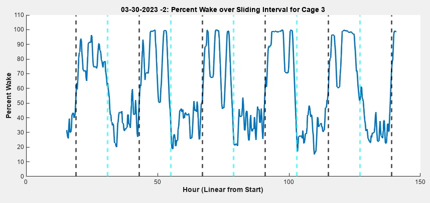 Percent Wake/Sleep over sliding interval graphically represents the animal’s high and low activity over the recording period.