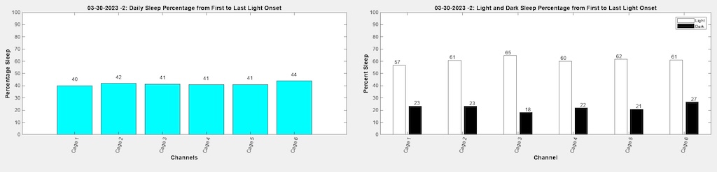 Percent Sleep bar graphs compare the percent sleep of all channels over the full recording displayed as total time (top) or separated by light and dark periods (bottom).