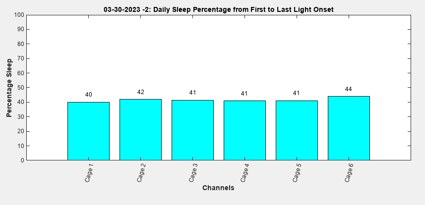 Percent Sleep bar graphs compare the percent sleep of all channels over the full recording displayed as total time (top) or separated by light and dark periods (bottom).